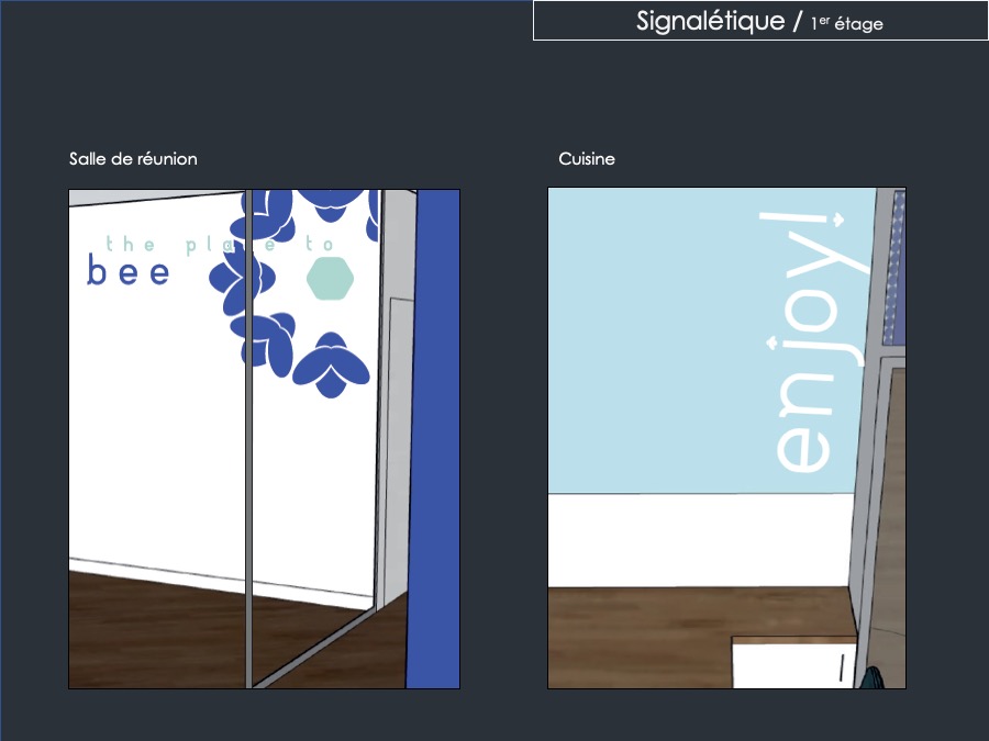 Au premier étage > création de salles de pause et déclinaison du concept décoratif dans l’ensemble des espaces de circulation et dans les espaces communs